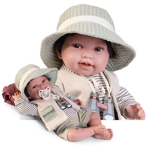 Ručně vyrobená realistická španělská panenka - miminko s realistickými prvky v obličeji a na končetinách. Ruce a nohy jsou k tělu přichycené kloubem s možností polohování, což miminku umožňuje třeba i samostatné sezení bez opory. Panenka má měkké látkové tělo, hlava a končetiny jsou vyrobené ze speciálního měkčeného vinylu, příjemného na dotek. Oblečení některých panenek bylo vyrobeno z organické bavlny, která zaručuje výrobu z ručně sbírané, ekologicky bez chemického ošetření pěstované bavlny. Firma Antonio Juan klade velký důraz na ekologii a proto jako první využívá v tomto odvětví zmíněnou bavlnu. Velikost 42 cm. Baleno v dárkové krabici. Doporučený věk od 3 let.