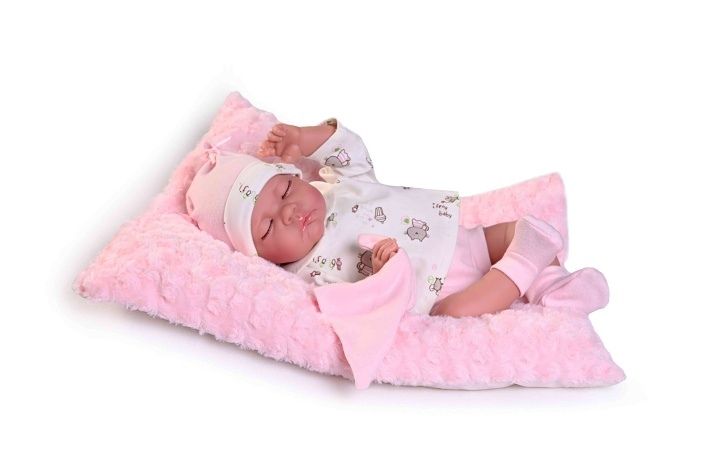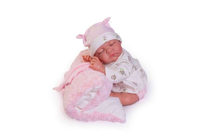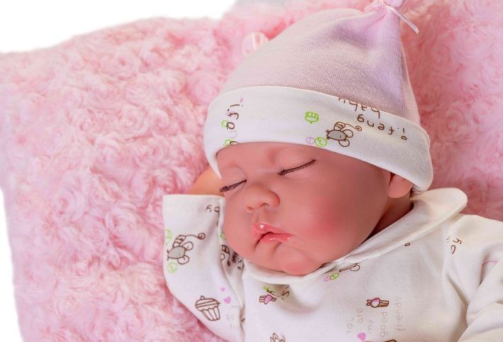 Spící, ručně vyrobená realistická španělská panenka - miminko s realistickými prvky v obličeji a na končetinách. Ruce a nohy jsou k tělu přichycené kloubem s možností polohování, což miminku umožňuje dát si ve spánku třeba ručičky za hlavu. Panenka má měkké látkové tělo, hlava a končetiny jsou vyrobené ze speciálního měkčeného vinylu, příjemného na dotek. Oblečení bylo vyrobeno z organické bavlny, která zaručuje výrobu z ručně sbírané, ekologicky bez chemického ošetření pěstované bavlny. Firma Antonio Juan klade velký důraz na ekologii a proto jako první využívá v tomto odvětví zmíněnou bavlnu. Velikost 42 cm. Baleno v dárkové krabici. Doporučený věk od 3 let.