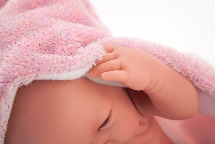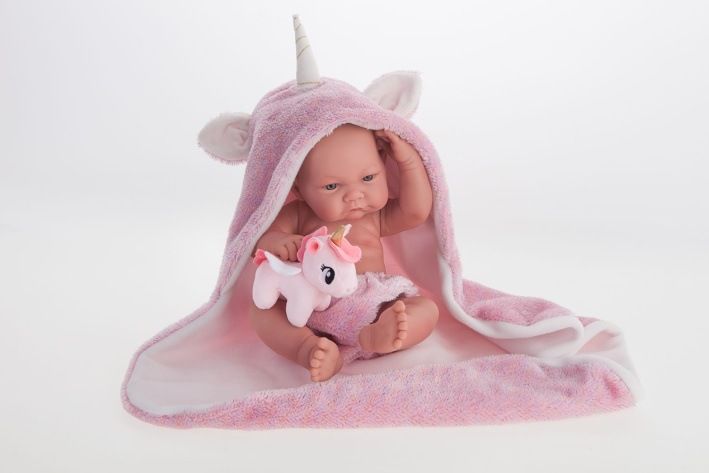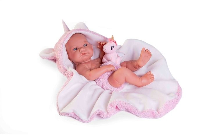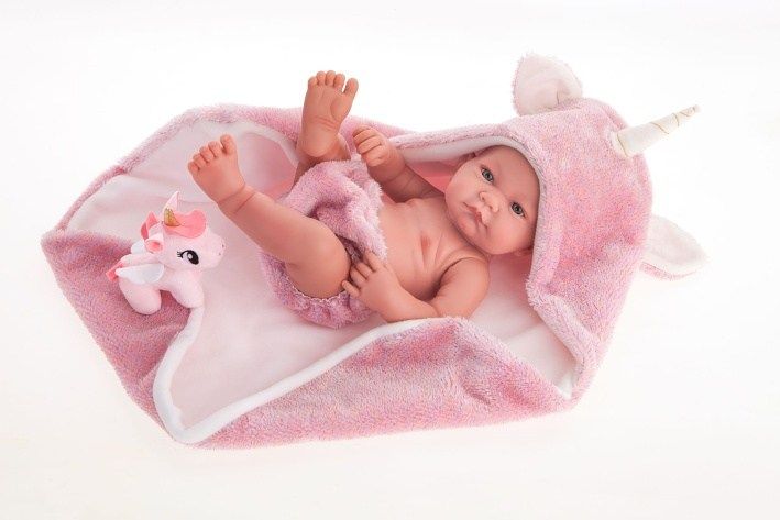 Ručně vyrobená realistická španělská panenka - miminko new born s celovinylovým tělem a realistickým vyobrazením různých miminkovských faldíků a detailů včetně pohlaví. Panenka je vyrobená ze speciálního měkčeného vinylu, velmi příjemného na dotek. Miminko lze koupat, ale je potřeba dát pozor, aby se nenamočily řasy. Odlepené řasy nejsou pak důvodem k reklamaci. Oblečení některých panenek bylo vyrobeno z organické bavlny, která zaručuje výrobu z ručně sbírané, ekologicky bez chemického ošetření pěstované bavlny. Firma Antonio Juan klade velký důraz na ekologii a proto jako první využívá v tomto odvětví zmíněnou bavlnu. Velikost 42 cm. Baleno v dárkové krabici. Doporučený věk od 3 let.