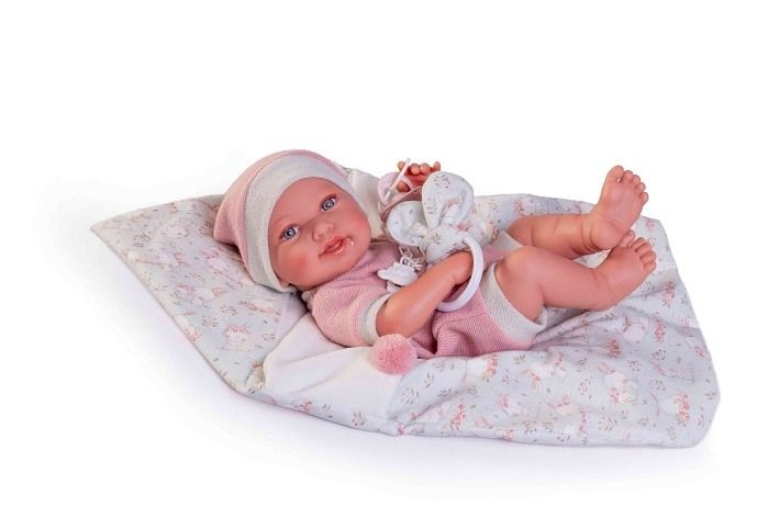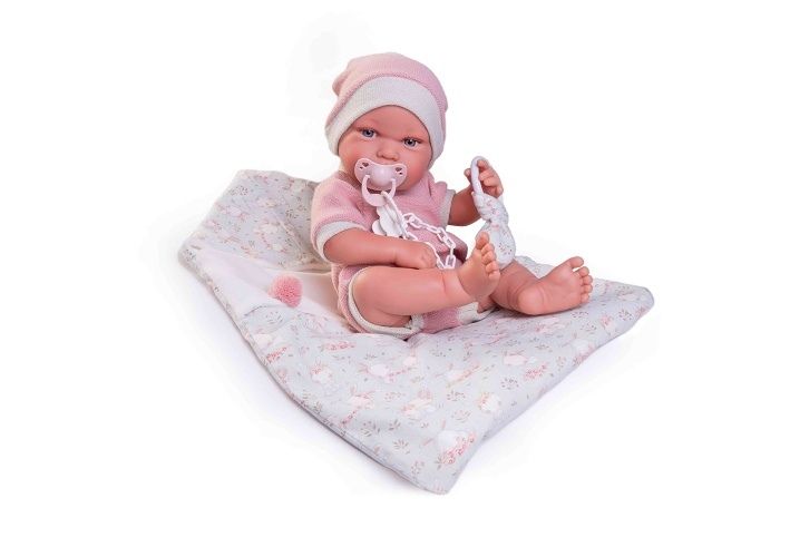 Ručně vyrobená realistická španělská panenka - miminko new born s celovinylovým tělem a realistickým vyobrazením různých miminkovských faldíků a detailů včetně pohlaví. Panenka je vyrobená ze speciálního měkčeného vinylu, velmi příjemného na dotek. Miminko lze koupat, ale je potřeba dát pozor, aby se nenamočily řasy. Odlepené řasy nejsou pak důvodem k reklamaci. Oblečení některých panenek bylo vyrobeno z organické bavlny, která zaručuje výrobu z ručně sbírané, ekologicky bez chemického ošetření pěstované bavlny. Firma Antonio Juan klade velký důraz na ekologii a proto jako první využívá v tomto odvětví zmíněnou bavlnu. Velikost 42 cm. Baleno v dárkové krabici. Doporučený věk od 3 let.