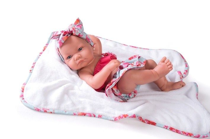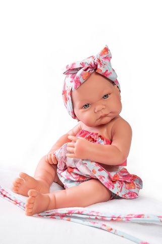 Ručně vyrobená realistická španělská panenka - miminko new born s celovinylovým tělem a realistickým vyobrazením různých miminkovských faldíků a detailů včetně pohlaví. Panenka je vyrobená ze speciálního měkčeného vinylu, velmi příjemného na dotek. Miminko lze koupat, ale je potřeba dát pozor, aby se nenamočily řasy. Odlepené řasy nejsou pak důvodem k reklamaci. Oblečení některých panenek bylo vyrobeno z organické bavlny, která zaručuje výrobu z ručně sbírané, ekologicky bez chemického ošetření pěstované bavlny. Firma Antonio Juan klade velký důraz na ekologii a proto jako první využívá v tomto odvětví zmíněnou bavlnu. Velikost 42 cm. Baleno v dárkové krabici. Doporučený věk od 3 let.