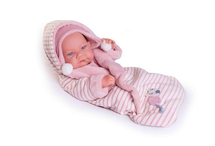 Ručně vyrobená realistická španělská panenka - miminko new born s celovinylovým tělem a realistickým vyobrazením různých miminkovských faldíků a detailů včetně pohlaví. Panenka je vyrobená ze speciálního měkčeného vinylu, velmi příjemného na dotek. Miminko lze koupat, ale je potřeba dát pozor, aby se nenamočily řasy. Odlepené řasy nejsou pak důvodem k reklamaci. Oblečení této panenky bylo vyrobeno z organické bavlny, která zaručuje výrobu z ručně sbírané, ekologicky bez chemického ošetření pěstované bavlny. Firma Antonio Juan klade velký důraz na ekologii a proto jako první využívá v tomto odvětví zmíněnou bavlnu. Velikost 42 cm. Baleno v dárkové krabici. Doporučený věk od 3 let.