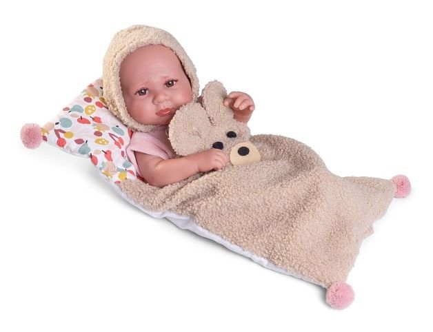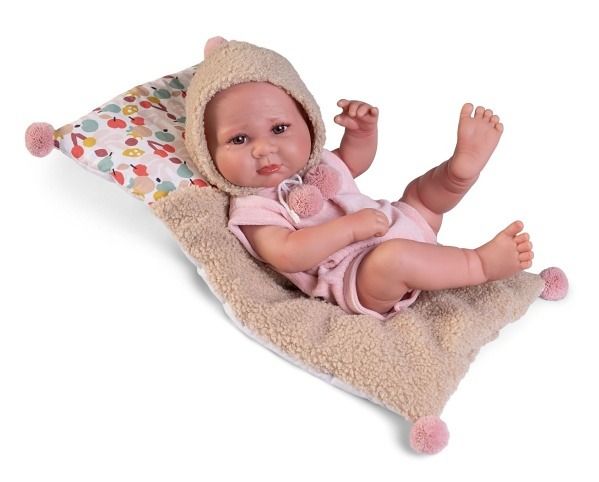Ručně vyrobená realistická španělská panenka - miminko new born s celovinylovým tělem a realistickým vyobrazením různých miminkovských faldíků a detailů včetně pohlaví. Panenka je vyrobená ze speciálního měkčeného vinylu, velmi příjemného na dotek. Miminko lze koupat, ale je potřeba dát pozor, aby se nenamočily řasy. Odlepené řasy nejsou pak důvodem k reklamaci. Oblečení některých panenek bylo vyrobeno z organické bavlny, která zaručuje výrobu z ručně sbírané, ekologicky bez chemického ošetření pěstované bavlny. Firma Antonio Juan klade velký důraz na ekologii a proto jako první využívá v tomto odvětví zmíněnou bavlnu. Velikost 42 cm. Baleno v dárkové krabici. Doporučený věk od 3 let.