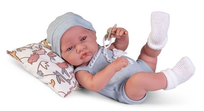Ručně vyrobená realistická španělská panenka - miminko new born s celovinylovým tělem a realistickým vyobrazením různých miminkovských faldíků a detailů včetně pohlaví. Panenka je vyrobená ze speciálního měkčeného vinylu, velmi příjemného na dotek. Miminko lze koupat, ale je potřeba dát pozor, aby se nenamočily řasy. Odlepené řasy nejsou pak důvodem k reklamaci. Oblečení některých panenek bylo vyrobeno z organické bavlny, která zaručuje výrobu z ručně sbírané, ekologicky bez chemického ošetření pěstované bavlny. Firma Antonio Juan klade velký důraz na ekologii a proto jako první využívá v tomto odvětví zmíněnou bavlnu. Velikost 42 cm. Baleno v dárkové krabici. Doporučený věk od 3 let.