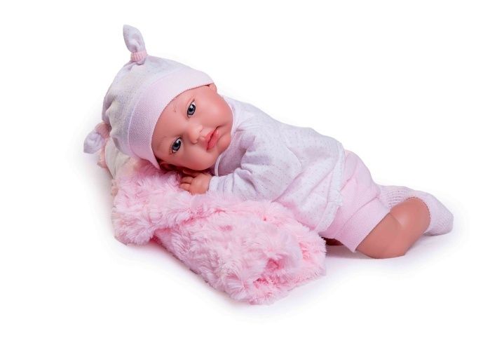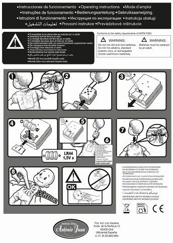 Mluvící, ručně vyrobená realistická španělská panenka - miminko. Po zatlačení na bříško začne panenka vydávat zvuky podobné dětskému žvatlání. Panenka má měkké látkové tělo, hlava a končetiny jsou vyrobené z kvalitního měkčeného vinylu. Oblečení některých panenek bylo vyrobeno z organické bavlny, která zaručuje výrobu z ručně sbírané, ekologicky bez chemického ošetření pěstované bavlny. Firma Antonio Juan klade velký důraz na ekologii a proto jako první využívá v tomto odvětví zmíněnou bavlnu. Velikost 34 cm. Baleno v dárkové krabici. Doporučený věk od 3 let. Součástí balení je 3 x knoflíková baterie LR44 s návodem na její výměnu. Baterie jsou spotřební zboží a proto jejich vybití není důvodem k reklamaci panenky.