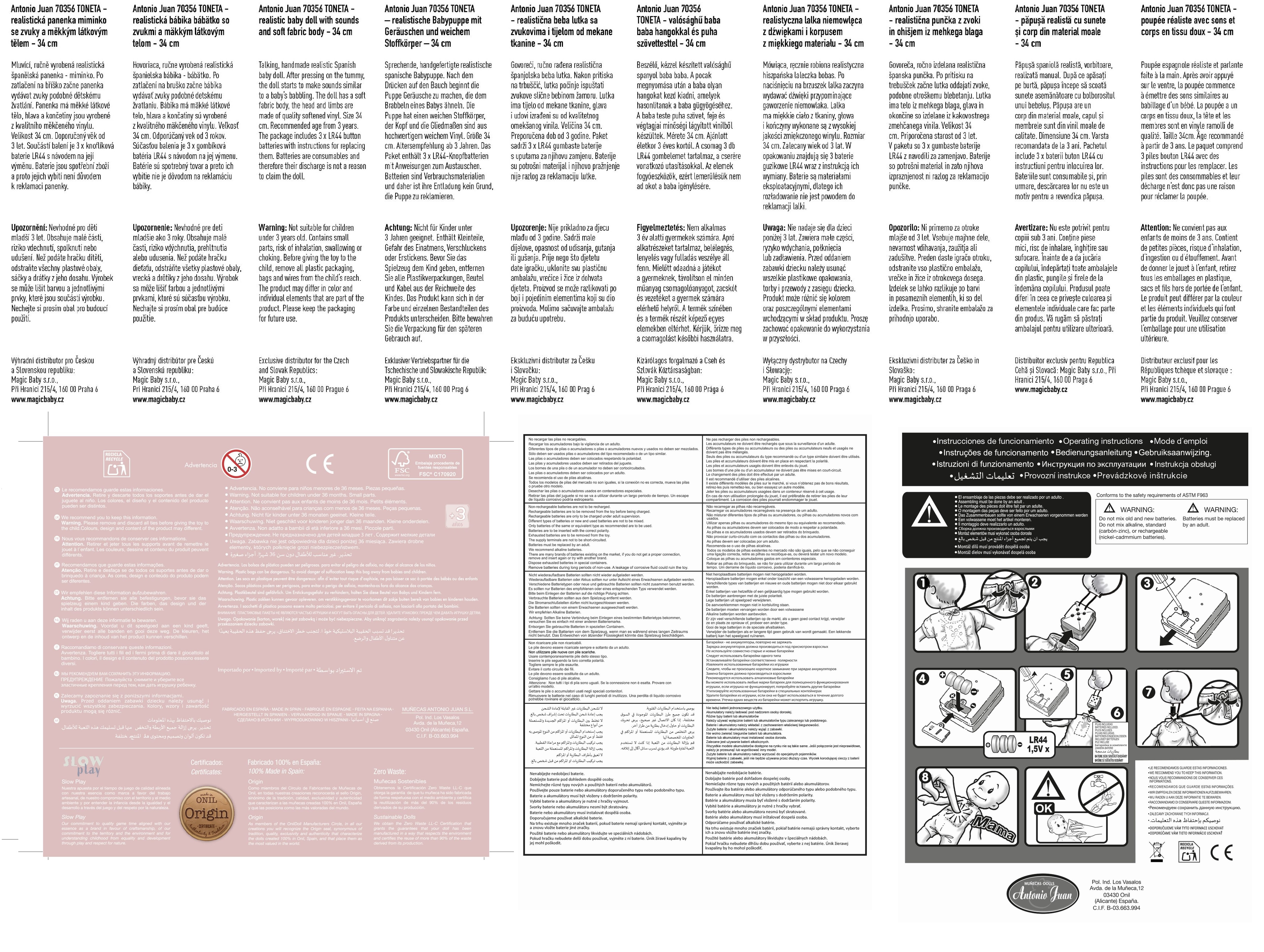 Mluvící, ručně vyrobená realistická španělská panenka - miminko. Po zatlačení na bříško začne panenka vydávat zvuky podobné dětskému žvatlání. Panenka má měkké látkové tělo, hlava a končetiny jsou vyrobené z kvalitního měkčeného vinylu. Oblečení některých panenek bylo vyrobeno z organické bavlny, která zaručuje výrobu z ručně sbírané, ekologicky bez chemického ošetření pěstované bavlny. Firma Antonio Juan klade velký důraz na ekologii a proto jako první využívá v tomto odvětví zmíněnou bavlnu. Velikost 34 cm. Baleno v dárkové krabici. Doporučený věk od 3 let. Součástí balení je 3 x knoflíková baterie LR44 s návodem na její výměnu. Baterie jsou spotřební zboží a proto jejich vybití není důvodem k reklamaci panenky.