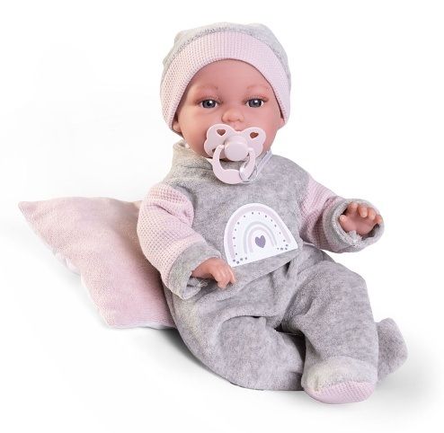 Ručně vyrobená realistická španělská panenka - miminko, se speciální pohybovou funkcí. Díky vnitřní opoře kostry těla, může dělat neobvyklé pohyby končetin, jako překřížit nožičky vleže, dát k sobě dlaně nebo zaujmat různé miminkovské polohy. Miminko má měkké látkové tělo, hlava a končetiny jsou vyrobené z kvalitního měkčeného vinylu. Oblečení některých panenek bylo vyrobeno z organické bavlny, která zaručuje výrobu z ručně sbírané, ekologicky bez chemického ošetření pěstované bavlny. Firma Antonio Juan klade velký důraz na ekologii a proto jako první využívá v tomto odvětví zmíněnou bavlnu. Velikost 34 cm. Baleno v dárkové krabici. Doporučený věk od 3 let.