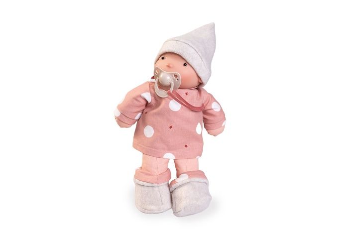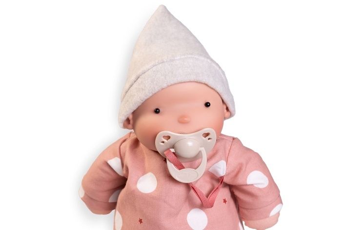 Ručně vyrobená španělská organická panenka s dudlíkem na magnet a měkkým látkovým tělem, vytvořená speciálně pro kojence a batolata. Tělo a končetiny jsou vyrobeny z organické bavlny, hlava ze 100% silikonu. Panenka je plněna měkkým PET vláknem z recyklovaných plastových láhví. Dudlík je vyroben z bio organických materiálů s přírodními pigmenty. Oblečení této panenky bylo vyrobeno z organické bavlny, která zaručuje výrobu z ručně sbírané, ekologicky bez chemického ošetření pěstované bavlny. Firma Antonio Juan klade velký důraz na ekologii a proto jako první využívá v tomto odvětví zmíněnou bavlnu. Velikost 26 cm. Baleno v dárkové krabici. Doporučený věk od 10 měsíců.