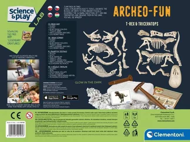 Tuto vědeckou sadu Archeologická sada T-rex a Triceratops si zamilujete, jelikož vám umožní prožít úžasnou bitvu mezi kořistí a predátorem! Získejte fosilie dvou obávaných dinosaurů: T-Rexe a Triceratopse a ocitněte se v období Jurské éry! S bezplatnou aplikací Legendary Creatures a vaším tabletem nebo smartphonem budou legendární tvorové oživovat přímo před vašima očima. Užijte si speciální efekty, pořiďte spoustu fotografií, upravujte je a sdílejte s přáteli. V balení najdete kladivo a dláto, takže se stanete opravdovým paleontologem. Sada vám pomůže rozvíjet vaše manuální dovednosti a motoriku.