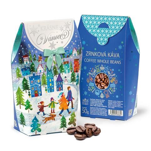 Pražená zrnková káva v luxusní dárkové krabičce s vánočním motívem a mašličkou. Vhodná jako dárek. Krabička kávy obdarovaného okouzlí nejen výbornou chutí, ale také krásným a originálním zevnějškem. Obsahuje 50g kávy, směs arabika robusta vysoké kvality. Kávu dodává rodinná pražírna Classic coffe, která na území města Piešťany na Slovensku působí od roku 1993.