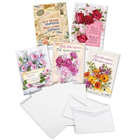 Bílý dopisní papír a bílé obálky. Listová - dopisní souprava obsahuje 10 ks papíru s linkami a 10 ks obálek. Rozměr papíru je 29,3 x 19,5 cm a rozměr obálky je 16,2 x 11,4 cm. V balení může být různý mix vyobrazených dopisních souprav dle dostupnosti.
