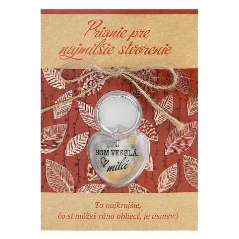 Speciální přání s dárkem SK. Karta obsahuje obálku, dárek - klíčenku s oboustranným potiskem a věnování. Slovenský text uvnitř přání: "Usmievaj sa každý deň, pretože úsmev Ti pristane. Prajem Ti veľa šťastia, zdravia, lásky, pohody a veľa krásnych dní plných príjemných maličkostí."