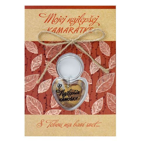 Speciální přání s dárkem. Karta obsahuje obálku, dárek - klíčenku s oboustranným potiskem a věnování. Slovenský text uvnitř přání: "Baví ma sedieť s Tebou pri káve, baví ma s Tebou vymetať obchody, baví ma, že si ma hocikedy vypočuješ... Nech je Tvoj život krásny a dokonalý... tak ako TY!"