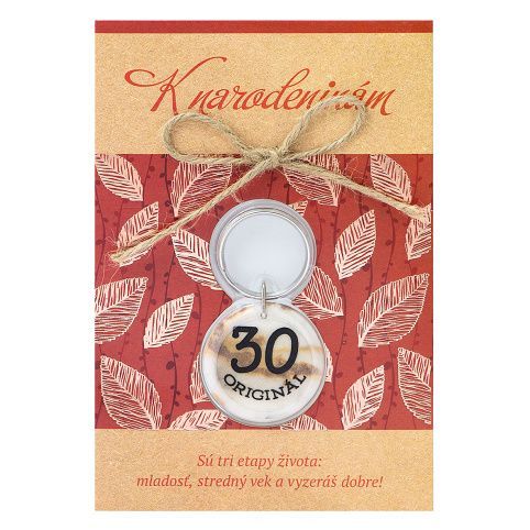 K narodeninám - speciální přání s dárkem. Karta obsahuje obálku, dárek - klíčenku s oboustranným potiskem a věnování. Slovenský text uvnitř přání: "Vyzeráš veľmi dobre a ešte si stále v prvej etape :). Prajem Ti veľa šťastia, zdravia, lásky a pohody... Všetko najlepšie!"