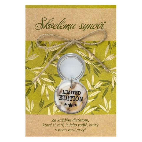 Skvelému synovi - speciální přání s dárkem. Karta obsahuje obálku, dárek - klíčenku s oboustranným potiskem a věnování. Slovenský text uvnitř přání: "Žiadny rodič nie je dokonalý... Ale pri pohľade na Teba mám pocit, že niečo sa mi v živote vydarilo :)"