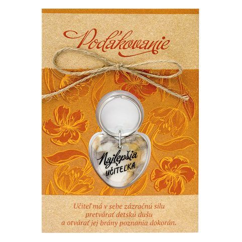 Poďakovanie - speciální přání s dárkem. Karta obsahuje obálku, dárek - klíčenku s oboustranným potiskem a věnování. Slovenský text uvnitř přání: "Ďakujem!"