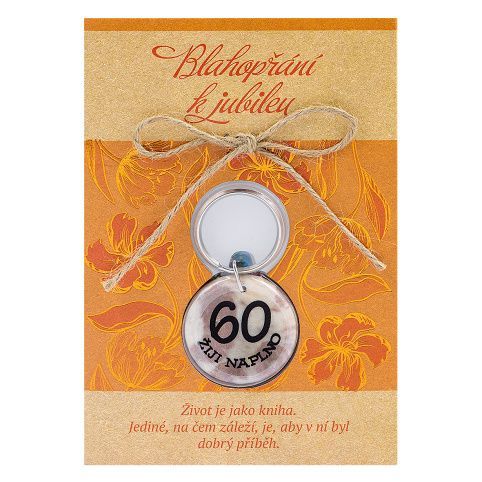 Blahopřání k jubileu - blahopřání s věnováním a s klíčenkou, která má oboustranní potisk. Součástí balení je kraftová obálka. Text uvnitř přáníčka: Šedesát let je 21 915 dnů, každý z nich byl jiný, jeden všední, jeden nádherný… Každý však stál za to žít, proto to musíš pořádně oslavit! Všechno nejlepší!