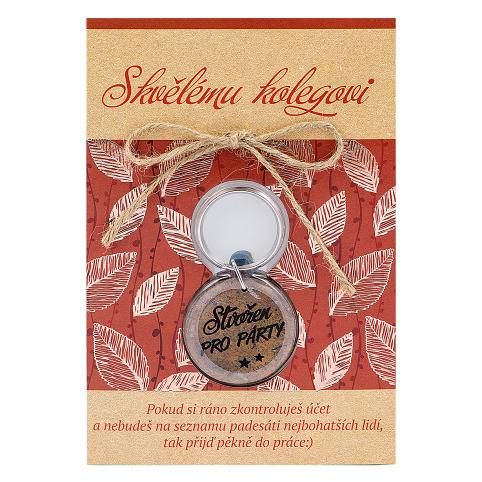 Skvělému kolegovi - blahopřání s věnováním a s klíčenkou, která má oboustranní potisk. Součástí balení je kraftová obálka. Text uvnitř přáníčka: Těšíme se na Tebe!