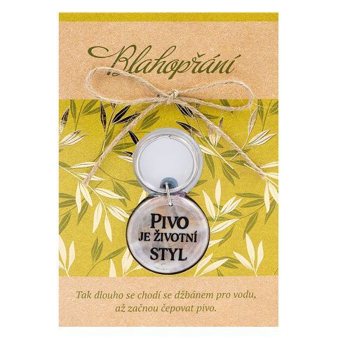 Blahopřání - blahopřání s věnováním a s klíčenkou, která má oboustranní potisk. Součástí balení je kraftová obálka. Text uvnitř přáníčka: V pivu je hodné vitamínů,… pokud ho piješ dost! Všechno nejlepší!