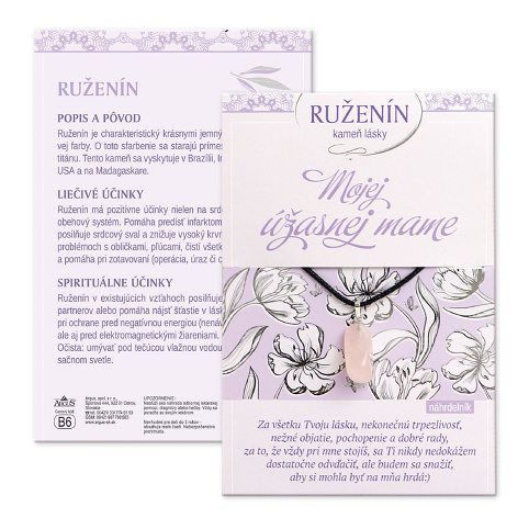 Mojej úžasnej mamine (slovensky) - speciální přání s dárkem. Karta obsahuje dárek – léčivý kámen a věnování. Zadní strana přání popisuje charakteristiku, původ kamene, léčivé a spirituální účinky. Přání neobsahuje obálku, je možné si ji doobjednat v poznámce k objednávce.