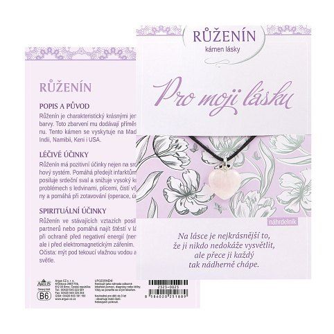 Pro moji lásku - jedinečné přání s dárkem, léčivým kamenem a věnováním. Na zadní straně přání najdete charakteristiku léčivého kamene - popis a původ, léčivé účinky a také jeho spirituální účinky.
