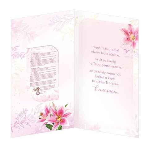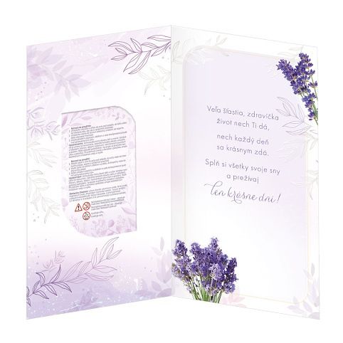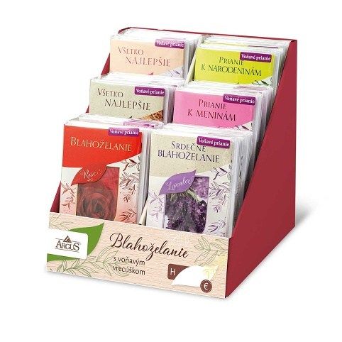 Blahopřání s voňavými sáčky. Obsahují vůně pivoňku, růži, levanduli, lilii, jasmín a santalové dřevo. Jsou skvělým dárkem pro ty, které máte rádi, ale je vhodné i do Vašeho auta nebo do různých částí Vašeho bytu. Všechna blahopřání mají slovenský text uvnitř. V boxu se nachází 10ks z každého designu.