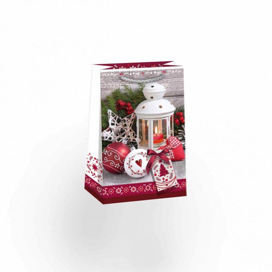Lesklá vánoční papírová dárková taška s originálním designem. Vyrobená z kvalitního pevného papíru pro rychlé a praktické zabalení dárků všech velikostí. Kvalita zpracování zaručuje dostatečnou pevnost proti protržení dna nebo odtržení oušek. Na tašce je průsvitné plastové ouško, které slouží k uchycení tašky na prodejním stojanu. Po zakoupení je možné ho jednoduše odstřihnout.