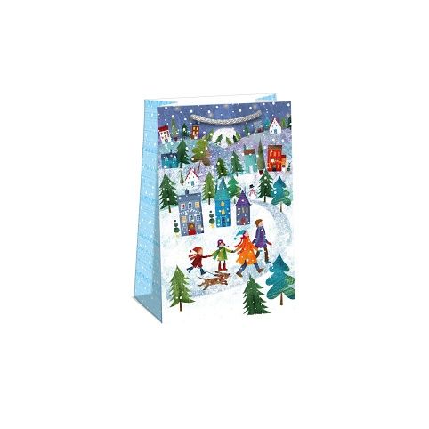 Vánoční papírová dárková taška s originálním designem. Vyrobená z kvalitního pevného papíru pro rychlé a praktické zabalení dárků všech velikostí. Kvalita zpracování zaručuje dostatečnou pevnost proti protržení dna nebo odtržení oušek. Na tašce je průsvitné plastové ouško, které slouží k uchycení tašky na prodejním stojanu. Po zakoupení je možné ho jednoduše odstřihnout.