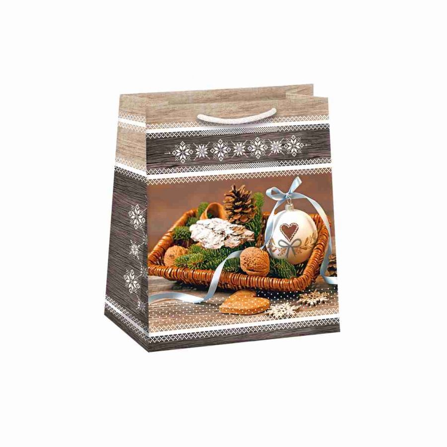 Lesklá vánoční papírová dárková taška s originálním designem. Vyrobená z kvalitního pevného papíru pro rychlé a praktické zabalení dárků všech velikostí. Kvalita zpracování zaručuje dostatečnou pevnost proti protržení dna nebo odtržení oušek.