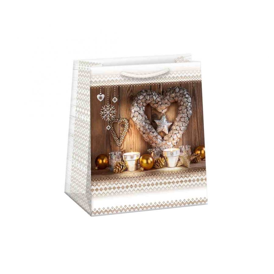 Lesklá vánoční papírová dárková taška s originálním designem. Vyrobená z kvalitního pevného papíru pro rychlé a praktické zabalení dárků všech velikostí. Kvalita zpracování zaručuje dostatečnou pevnost proti protržení dna nebo odtržení oušek.