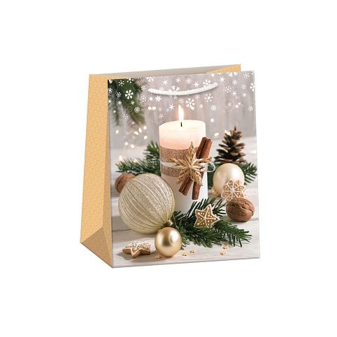 Lesklá vánoční papírová dárková taška s originálním designem. Vyrobená z kvalitního pevného papíru pro rychlé a praktické zabalení dárků všech velikostí. Kvalita zpracování zaručuje dostatečnou pevnost proti protržení dna nebo odtržení oušek.