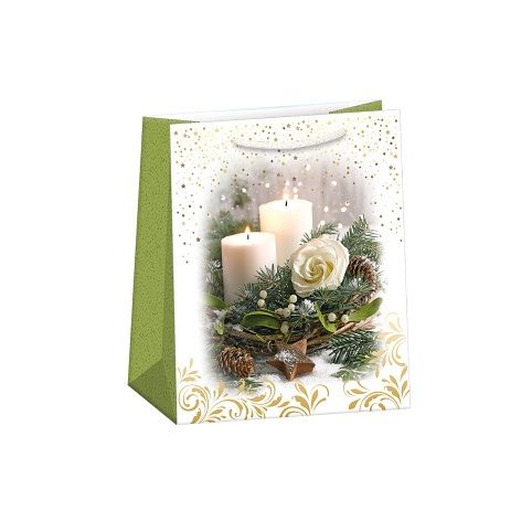 Lesklá vánoční papírová dárková taška s originálním designem. Vyrobená z kvalitního pevného papíru pro rychlé a praktické zabalení dárků všech velikostí. Kvalita zpracování zaručuje dostatečnou pevnost proti protržení dna nebo odtržení oušek.