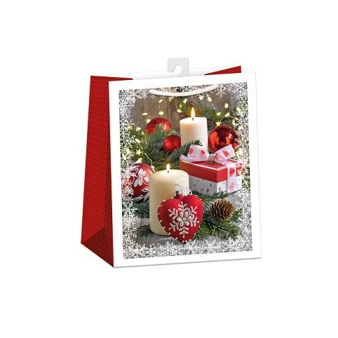 Lesklá vánoční papírová dárková taška s originálním designem. Vyrobená z kvalitního pevného papíru pro rychlé a praktické zabalení dárků všech velikostí. Kvalita zpracování zaručuje dostatečnou pevnost proti protržení dna nebo odtržení oušek. Na tašce je průsvitné plastové ouško, které slouží k uchycení tašky na prodejním stojanu. Po zakoupení je možné ho jednoduše odstřihnout.
