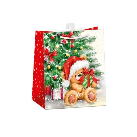Matná vánoční papírová dárková taška s originálním designem. Vyrobená z kvalitního pevného papíru pro rychlé a praktické zabalení dárků. Kvalita zpracování zaručuje dostatečnou pevnost proti protržení dna nebo odtržení oušek. Na tašce je průsvitné plastové ouško, které slouží k uchycení tašky na prodejním stojanu. Po zakoupení je možné ho jednoduše odstřihnout.