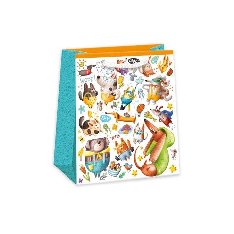 Papírová dárková taška standard s háčkem a originálním dětským designem. Vyrobená z kvalitního pevného papíru pro rychlé a praktické zabalení dárků všech velikostí. Kvalita zpracování zaručuje dostatečnou pevnost proti protržení dna nebo odtržení oušek. Háček slouží k umístění do stojanů v prodejnách. Po zakoupení jej lze jednoduše odstřihnout.