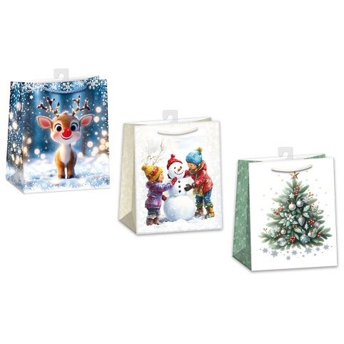 Vánoční papírová dárková taška s originálním designem. * vyrobená z kvalitního pevného papíru pro rychlé a praktické zabalení dárků všech velikostí* kvalita zpracování zaručuje dostatečnou pevnost proti protržení dna nebo odtržení oušek* na tašce je průsvitné plastové ouško, které slouží k uchycení tašky na prodejním stojanu. Po zakoupení je možné ho jednoduše odstřihnout