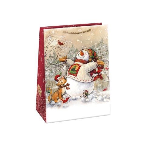 Vánoční papírová dárková taška s originálním designem. Vyrobená z kvalitního pevného papíru pro rychlé a praktické zabalení dárků všech velikostí. Kvalita zpracování zaručuje dostatečnou pevnost proti protržení dna nebo odtržení oušek. Na tašce je průsvitné plastové ouško, které slouží k uchycení tašky na prodejním stojanu. Po zakoupení je možné ho jednoduše odstřihnout.