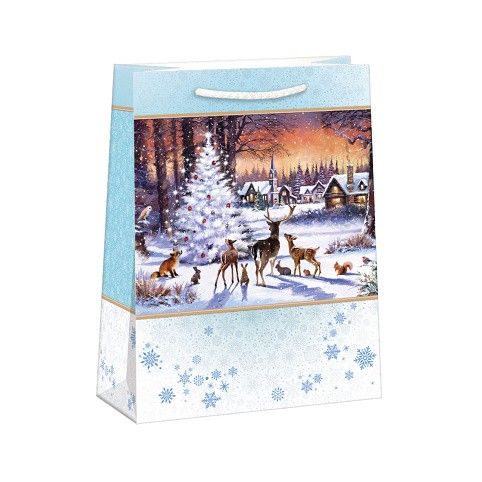 Lesklá vánoční papírová dárková taška s originálním designem. Vyrobená z kvalitního pevného papíru pro rychlé a praktické zabalení dárků všech velikostí. Kvalita zpracování zaručuje dostatečnou pevnost proti protržení dna nebo odtržení oušek. Na tašce je průsvitné plastové ouško, které slouží k uchycení tašky na prodejním stojanu. Po zakoupení je možné ho jednoduše odstřihnout.