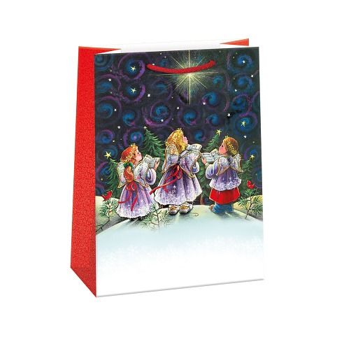 Vánoční papírová dárková taška s originálním designem. Vyrobená z kvalitního pevného papíru pro rychlé a praktické zabalení dárků všech velikostí. Kvalita zpracování zaručuje dostatečnou pevnost proti protržení dna nebo odtržení oušek. Na tašce je průsvitné plastové ouško, které slouží k uchycení tašky na prodejním stojanu. Po zakoupení je možné ho jednoduše odstřihnout.