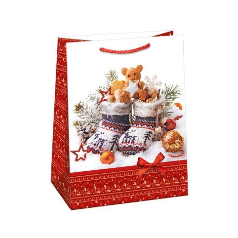 Lesklá vánoční papírová dárková taška s originálním designem. Vyrobená z kvalitního pevného papíru pro rychlé a praktické zabalení dárků všech velikostí. Kvalita zpracování zaručuje dostatečnou pevnost proti protržení dna nebo odtržení oušek. Na tašce je průsvitné plastové ouško, které slouží k uchycení tašky na prodejním stojanu. Po zakoupení je možné ho jednoduše odstřihnout.