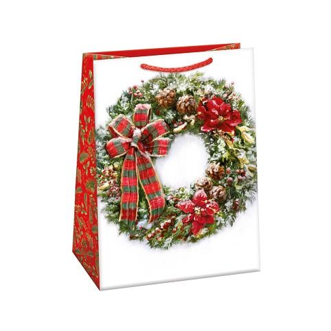 Vánoční papírová dárková taška s originálním designem. Vyrobená z kvalitního pevného papíru pro rychlé a praktické zabalení dárků všech velikostí. Kvalita zpracování zaručuje dostatečnou pevnost proti protržení dna nebo odtržení oušek. Na tašce je průsvitné plastové ouško, které slouží k uchycení tašky na prodejním stojanu. Po zakoupení je možné ho jednoduše odstřihnout.