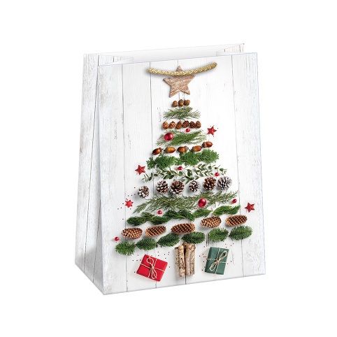 Vánoční papírová dárková taška s originálním designem. Vyrobená z kvalitního pevného papíru pro rychlé a praktické zabalení dárků všech velikostí. Kvalita zpracování zaručuje dostatečnou pevnost proti protržení dna nebo odtržení oušek. Na tašce je průsvitné plastové ouško, které slouží k uchycení tašky na prodejním stojanu. Po zakoupení je možné ho jednoduše odstřihnout.