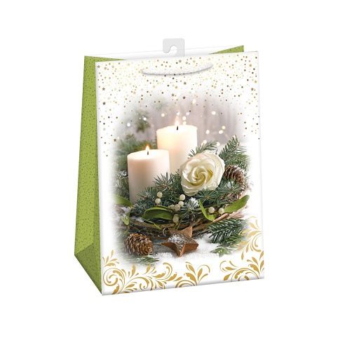 Lesklá vánoční papírová dárková taška s originálním designem. Vyrobená z kvalitního pevného papíru pro rychlé a praktické zabalení dárků všech velikostí. Kvalita zpracování zaručuje dostatečnou pevnost proti protržení dna nebo odtržení oušek. Na tašce je průsvitné plastové ouško, které slouží k uchycení tašky na prodejním stojanu. Po zakoupení je možné ho jednoduše odstřihnout.