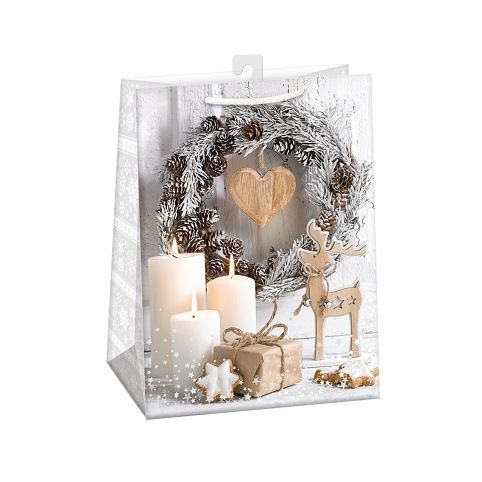 Lesklá vánoční papírová dárková taška s originálním designem. Vyrobená z kvalitního pevného papíru pro rychlé a praktické zabalení dárků všech velikostí. Kvalita zpracování zaručuje dostatečnou pevnost proti protržení dna nebo odtržení oušek. Na tašce je průsvitné plastové ouško, které slouží k uchycení tašky na prodejním stojanu. Po zakoupení je možné ho jednoduše odstřihnout.