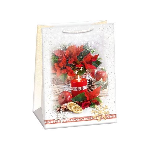 Lesklá vánoční papírová dárková taška s originálním designem. Vyrobená z kvalitního pevného papíru pro rychlé a praktické zabalení dárků všech velikostí. Kvalita zpracování zaručuje dostatečnou pevnost proti protržení dna nebo odtržení oušek.
