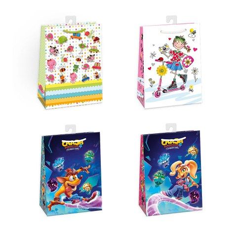 Papírová dárková taška mix s háčkem a originálními designy pro děti. * vyrobená z kvalitního pevného papíru pro rychlé a praktické zabalení dárků všech velikostí* kvalita zpracování zaručuje dostatečnou pevnost proti protržení dna nebo odtržení oušek* háček slouží k umístění do stojanů v prodejnách, po zakoupení jej lze jednoduše odstřihnout*