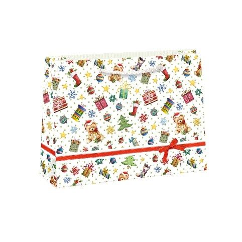 Vánoční papírová dárková taška s originálním designem. Vyrobená z kvalitního pevného papíru pro rychlé a praktické zabalení dárků všech velikostí. Kvalita zpracování zaručuje dostatečnou pevnost proti protržení dna nebo odtržení oušek.
