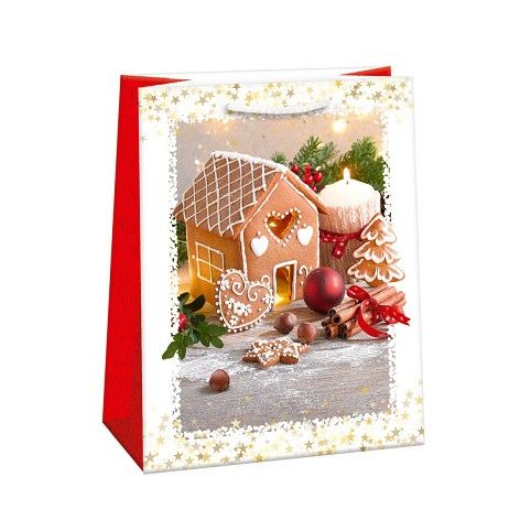 Lesklá vánoční papírová dárková taška s originálním designem. Vyrobená z kvalitního pevného papíru pro rychlé a praktické zabalení dárků všech velikostí. Kvalita zpracování zaručuje dostatečnou pevnost proti protržení dna nebo odtržení oušek.