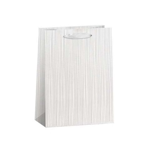 Papírová dárková taška s háčkem a originálním designem - SILVER STRIPES. Vyrobená z kvalitního pevného papíru pro rychlé a praktické zabalení dárků všech velikostí. Kvalita zpracování zaručuje dostatečnou pevnost proti protržení dna nebo odtržení oušek.