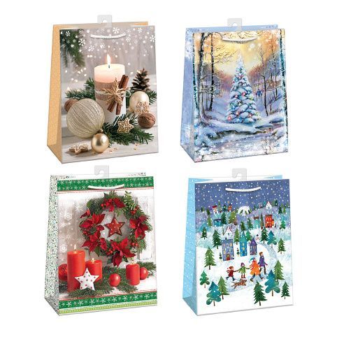 Vánoční papírová dárková taška s originálním designem. Vyrobená z kvalitního pevného papíru pro rychlé a praktické zabalení dárků všech velikostí. Kvalita zpracování zaručuje dostatečnou pevnost proti protržení dna nebo odtržení oušek. Na tašce je průsvitné plastové ouško, které slouží k uchycení tašky na prodejním stojanu. Po zakoupení je možné ho jednoduše odstřihnout.